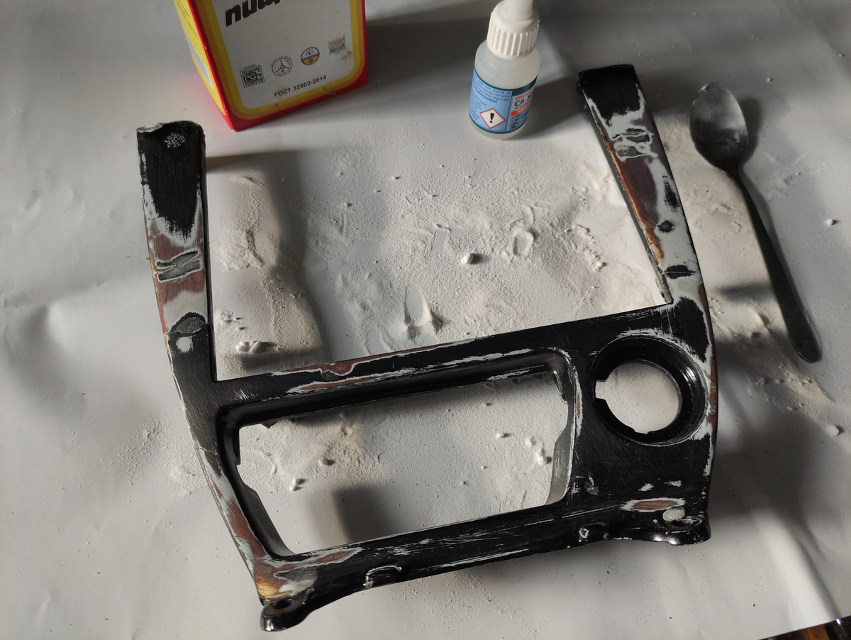 Доброго всем времени суток, наконец дошли руки до многострадальческой рамки, моя, то что была при покупки была несчадно порезана из за большой магнитолы, сломана по бокам и затянута в пленку (при этом похабно в гармошку), после установки нормального типоразмера мафона это все безобразие мазолило глаз. Подвернулось мне объявление о продаже запчастей 180 сеялки, каких именно будет выкладываться постепенно позже, а пока начнем с рамки. Та что была куплена оказалась так же сломана, но уже в более заводском состоянии. Делал подобные работы впервые поэтому помидорами не кидать)) Купил космофен, сода и наждачка были дома, заливаем все трещины а также места где сломано космофеном и обильно посыпаем содой, можно повторить для пущего эффекта, схватывает намертво, кто делал, знает) После чего проходимся наждачкой, чтобы выравнять поверхность, по итогу получилось вот так: Далеё в леруа мерлене были куплены: уайт-спирит, грунт, краска черная матовая, а также матовый лак в балончиках. Расположившись