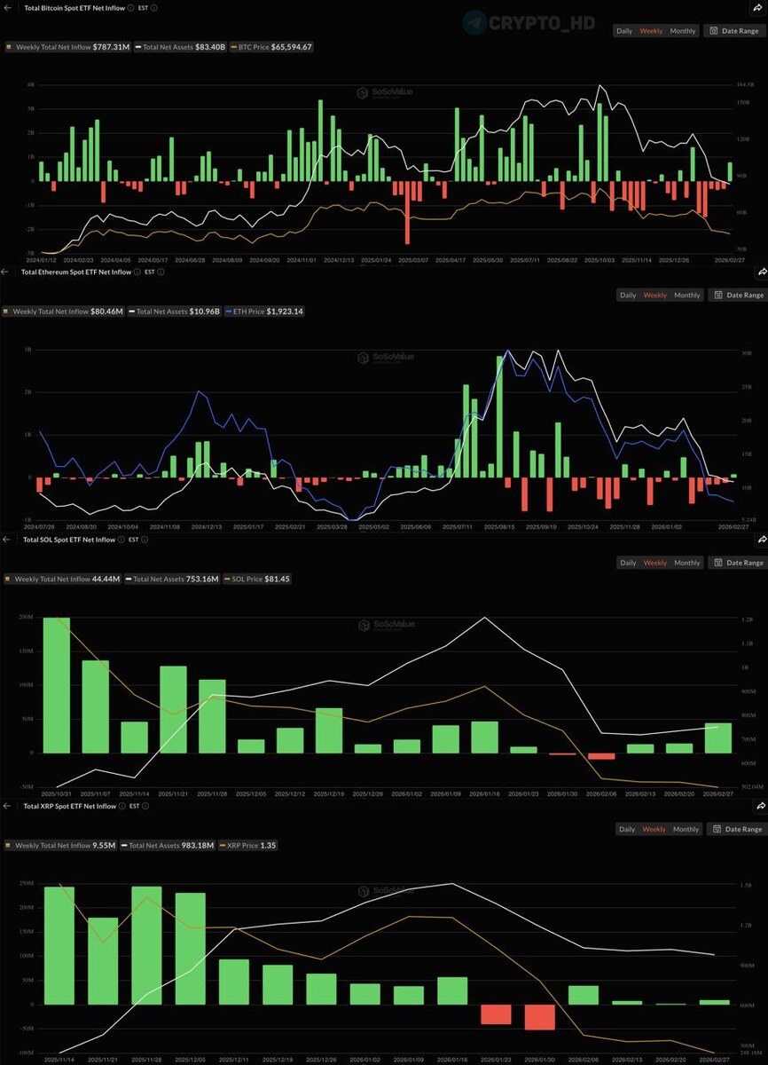βΉ Bitcoin ETF (#BTC) = +$787,310,000. βΉ Ethereum ETF (#ETH) = +$80,460,000. βΉ Solana ETF (#SOL) = +$44,440,000. βΉ Ripple ETF (#XRP) = +9,550,000. βΉ Chainlink ETF (#LINK) = +$4,270,000. βΉ Avalanche (#AVAX) = +$2,580,000. βΉ Hedera ETF (#HBAR) = +$927,270. βΉ Litecoin ETF (#LTC), Dogecoin ETF (#DOGE) = $0 (ΠΈΠ»ΠΈ Π½Π΅Ρ Π΄Π°Π½Π½ΡΡ
