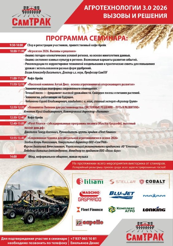 Уже 12 марта ждем Вас на семинаре «СамТРАК» «Агротехнологии 3.0. Сезон 2026. Вызовы и решения» Получаем ответы на актуальные вопросы: