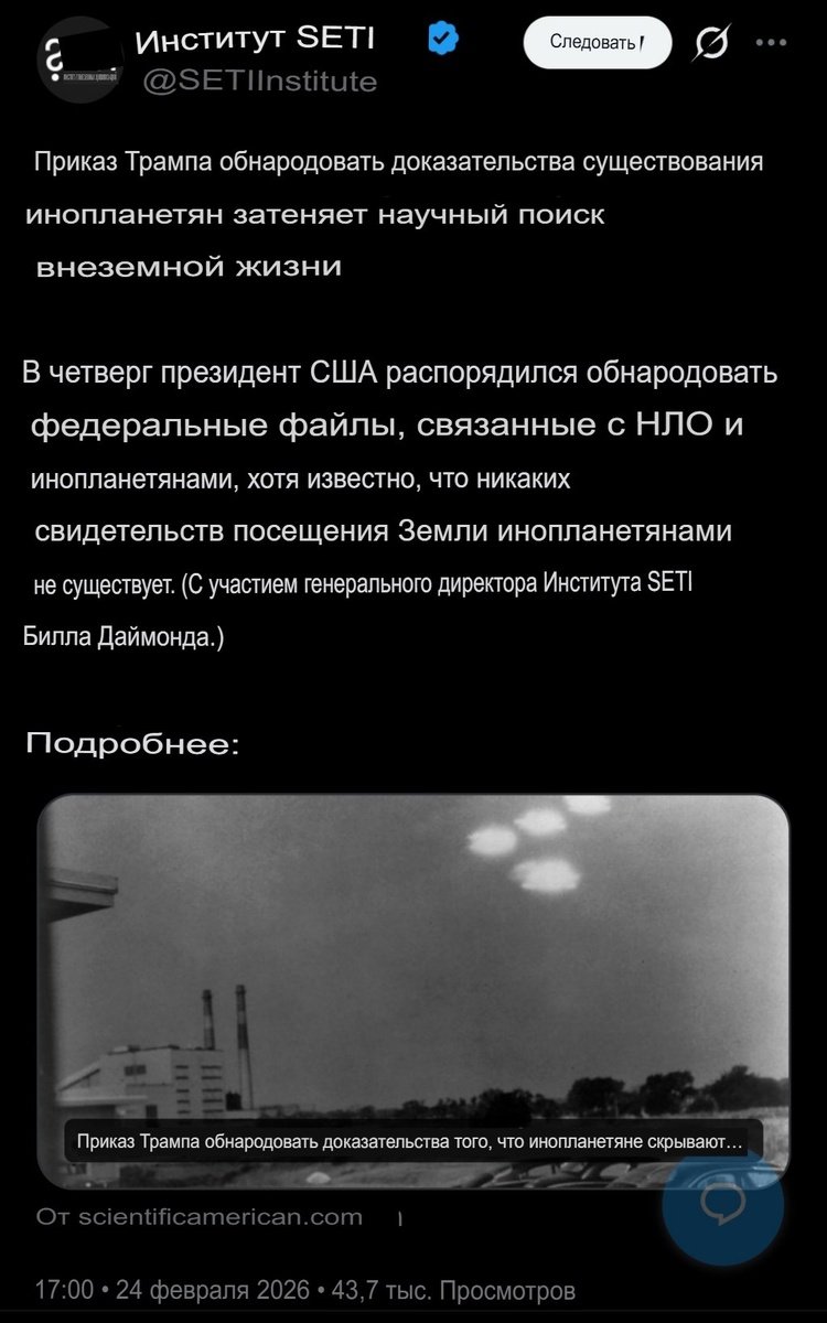 ". Это не ученые стремящиеся узнать истину, это уфологическая инквизиция, цель которой "искать" бесконечно, но у них нет цели найти. Это просто организация цель которой морочить людям головы. "Билл Даймонд, 69-летний президент Института SETI (Search for Extraterrestrial Intelligence) — ведущей научной организации, посвященной поиску жизни за пределами Земли, — полностью поддерживает тезис о существовании внеземной жизни . «О да, я действительно верю, что инопланетяне реальны. Определенно, — заявил ученый. — Жизнь, вероятно, очень распространена во Вселенной» . Даймонд пояснил, что вопрос о вере в инопланетян — один из ключевых при приеме на работу в SETI: «Если вы не верите в инопланетян, то, вероятно, нет смысла работать у нас» . На вопрос о том, как могут выглядеть внеземные существа, Даймонд предлагает обрати Показать полностью... Терра инкогнита | Неизвестная земля
