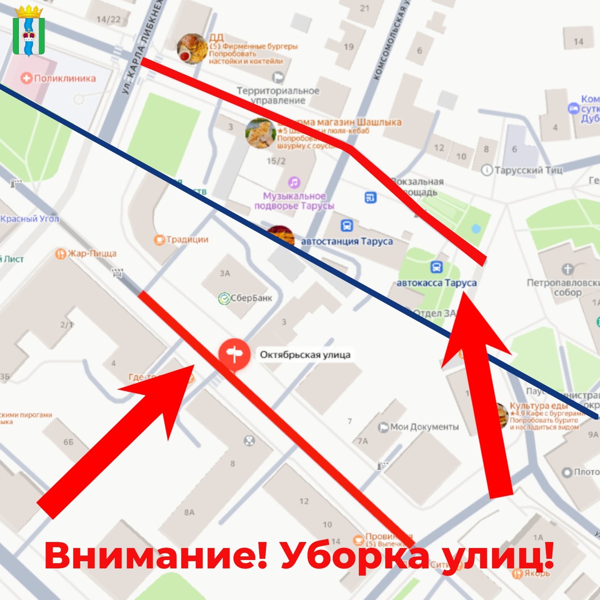 ! Сегодня, 2 марта, с 20:00 коммунальные службы будут расчищать: - участок ул. Октябрьской от пересечения с ул. Володарского (д. 14) до поворота напротив дома 4, - участок улицы Р. Люксембург от перекрестка с ул. К. Либкнехта до вокзальной площади. Убедительно просим убрать припаркованные автомобили. #ТарусскийОкруг
