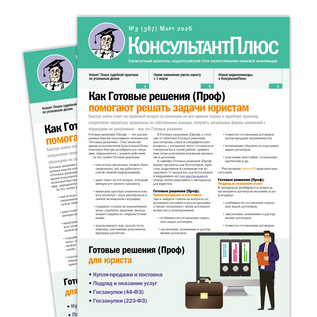 Читайте в выпуске: ✅ «Как Готовые решения (Проф) помогают решать задачи юристам» ✅ «Новые возможности системы КонсультантПлюс» ✅ «Новое! Поиск судебной практики по уголовным делам по результатам рассмотрения дела» ✅ «Какие изменения учесть юристу с 1 марта» ✅ «Новые видеосеминары КонсультантПлюс» Перейти к выпуску ⏩
