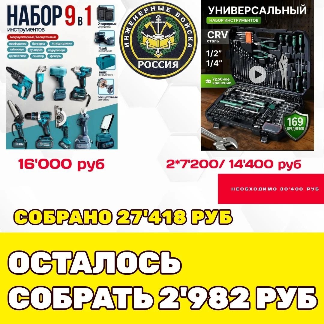 Добьём сегодня сбор ❓для инженерно-саперного батальона на 1. Набор инструментов 9 в 1 - 16'000 руб. 2. Универсальный набор инструментов - 2 шт. - 14'400 руб. 🚩Сумма к сбору - 30'400 руб. 🔺Собрано - 27'418 руб. 🔺Осталось собрать - 2'982 руб. Поддержите, пожалуйста, сбор. Любую посильную сумму можно перевести на номер карты 💳2202208188194204 или по номеру телефона 📞+79530562233 Получатель - Светлана Владимировна Л. ("Сбербанк") ❤️Спасибо большое вам за поддержку! #уралсвоихнебросает #помощьраненым #медицинскаяпомощь #вместемысправимся