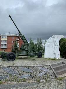 И рядом установлена зенитка, в память об воздушной обороне во время прохождения колонны машин по льду.