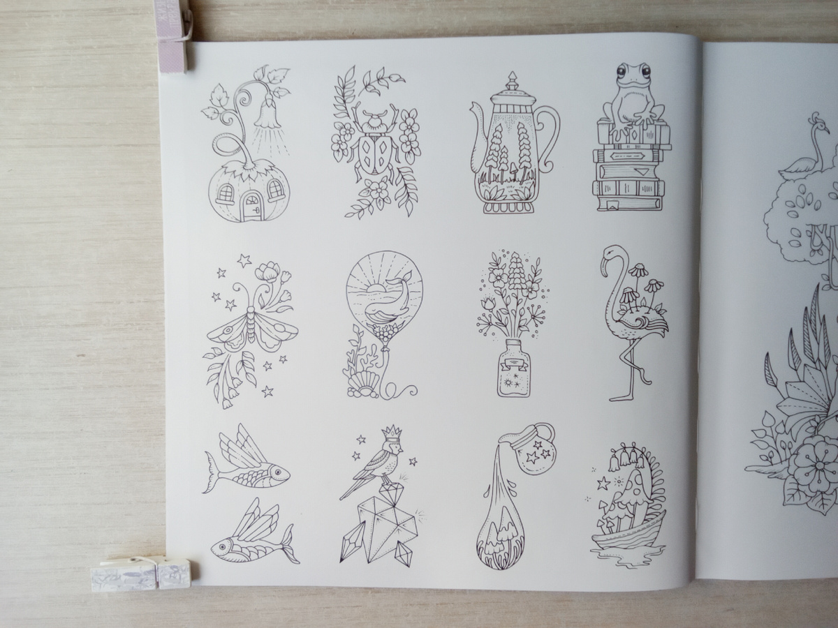 Не так давно раскрасила страничку с миниатюрными сладостями в раскраске Small Victories. И вот опять взялась за нечто подобное, но уже в другой раскраске Джоанны Бэсфорд. В Magical Worlds решила покрасить первую страницу в книге, а там как раз миниатюры.