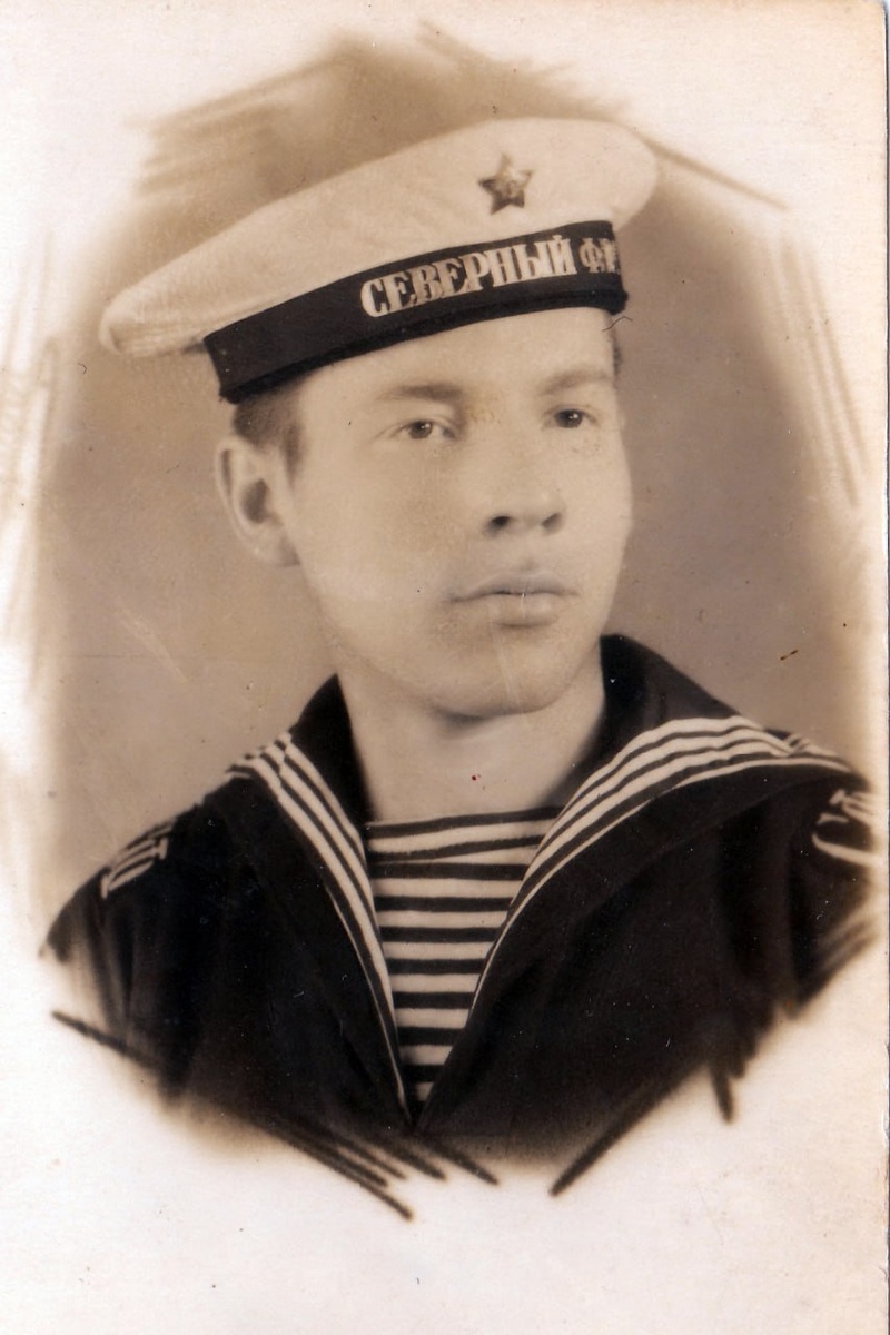 Матрос Северного флота в суконной форменной рубахе нашивными погончиками с литерами СФ образца 1943 года и бескозырке с белым
