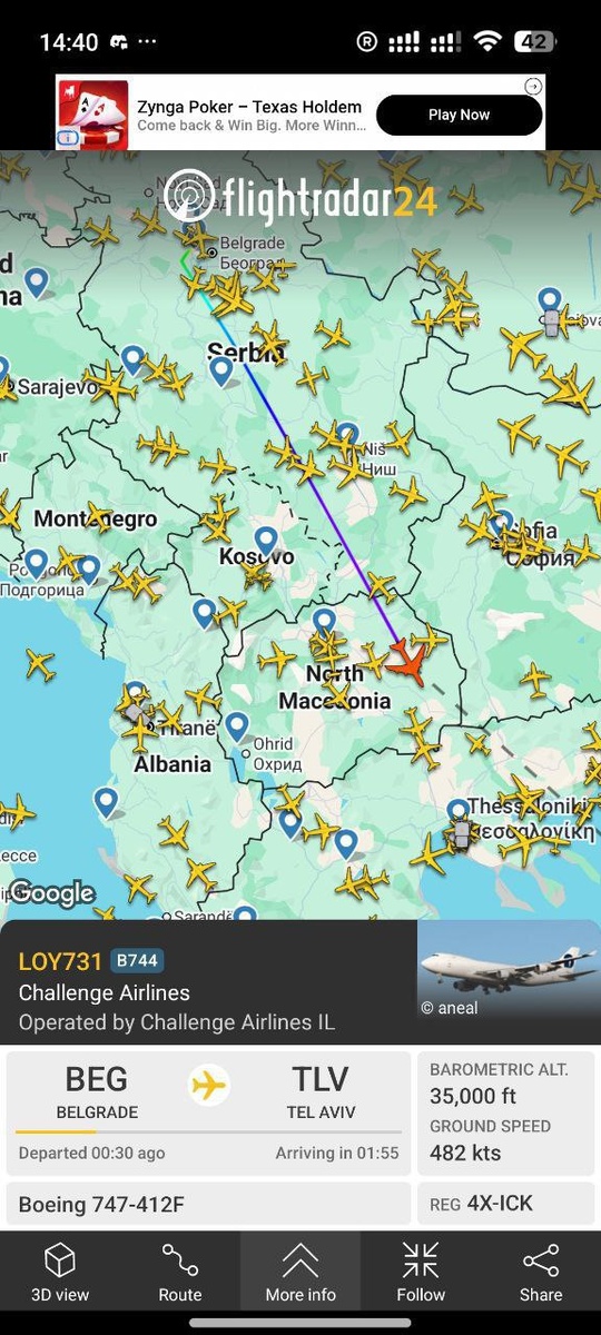 🇷🇸🇮🇱 Сербские каналы пишут, что израильский военно-транспортный самолет Boeing 747 вылетел из Белграда и направляется в Тель-Авив