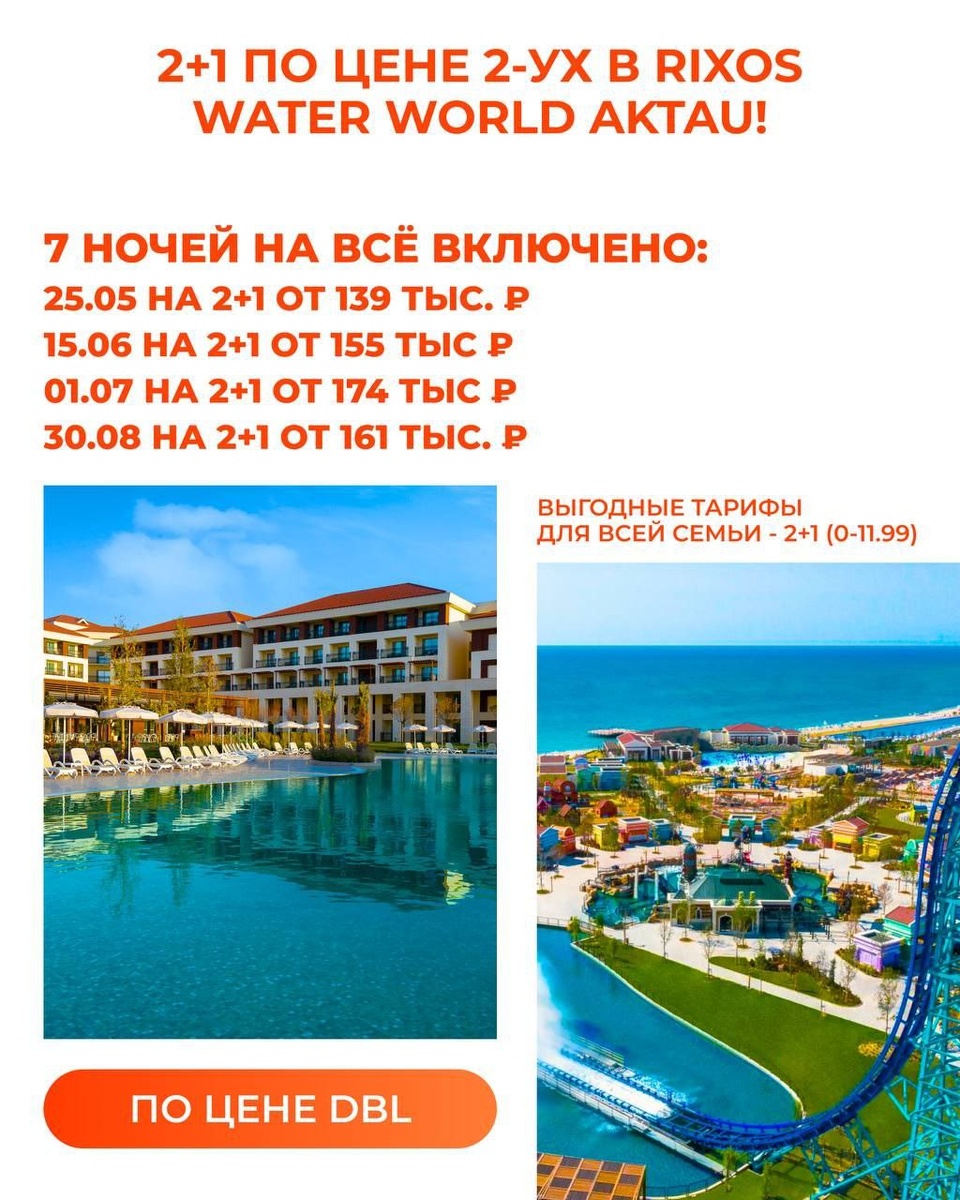 !⭐️ Выгодные тарифы для всей семьи - 2+1 (0-11.99) по цене DBL🤩🔥 ✨ 5★ курорт Rixos прямо в Актау — это: 🏝 Ultra All Inclusive по-настоящему премиального уровня 💦 Аквапарк, шоу, гастрономия и море развлечений 👨👩👧👦 Детский клуб Rixy, спа, спорт и стиль для всей семьи 🌅 Чистейший пляж, тёплая вода и атмосфера полного перезаряда 7 ночей на Всё включено: 📆 25.05 на 2+1 — от 139 тыс. ₽ 📆 15.06 на 2+1 — от 155 тыс. ₽ 📅 01.07 на 2+1 — от 174 тыс. ₽ 📆 30.08 на 2+1 — от 161 тыс. ₽ ✨ Наслаждайтесь каждой минутой в Rixos Water World Aktau — там, где отдых превращается в событие! Не упустите возможность подарить себе и близким настоящее приключение