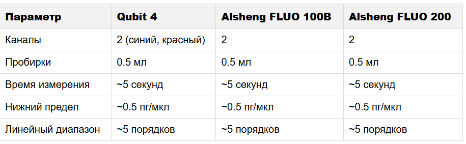 Вывод: FLUO 100B / FLUO 200 и Qubit 4 — демонстрируют сопоставимые результаты.