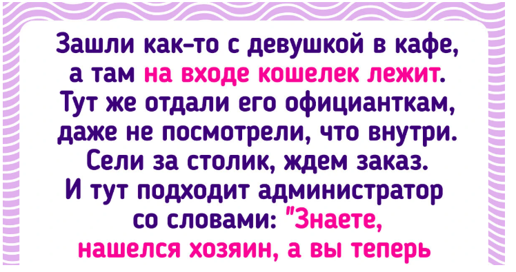 - Однажды мы с девушкой зашли в кафе, а на входе лежал кошелек. Его тут же подобрали официантки, даже не посмотрев, что внутри. Мы сели за столик и ждали заказ, как вдруг подошёл администратор и сказал: «Знаете, нашли владельца. А вы теперь в знак нашей признательности можете пройти в мягкую зону с кожаными диванами и телевизорами». Через полгода в новостях я увидел сюжет о точно такой же ситуации в том же месте, но там парень забрал кошелек и скрылся. А я даже не знал, что там стояла камера. © Hedgehoguse
