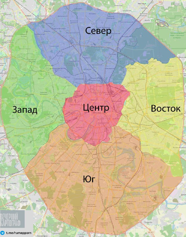 Настолько впечатлился поездкой в Бибирево, что решил изучить историю путепроводов на севере Москвы. Изучил (и обязательно поделюсь), но в процессе озаботился вопросом: а что такое север Москвы на моей ментальной карте? А заодно и остальные стороны света. Озаботился – и нарисовал вот такое: Центр более-менее совпадает с границами города на конец XVIII века с поправкой на Третье кольцо, которое служит ооочень мощной ментальной границей. Восточной границей центра служит Яуза. В общем, похоже на ЦАО, но с включением Марьиной рощи – почему ее в 1991-м отдали САО – ума не приложу.