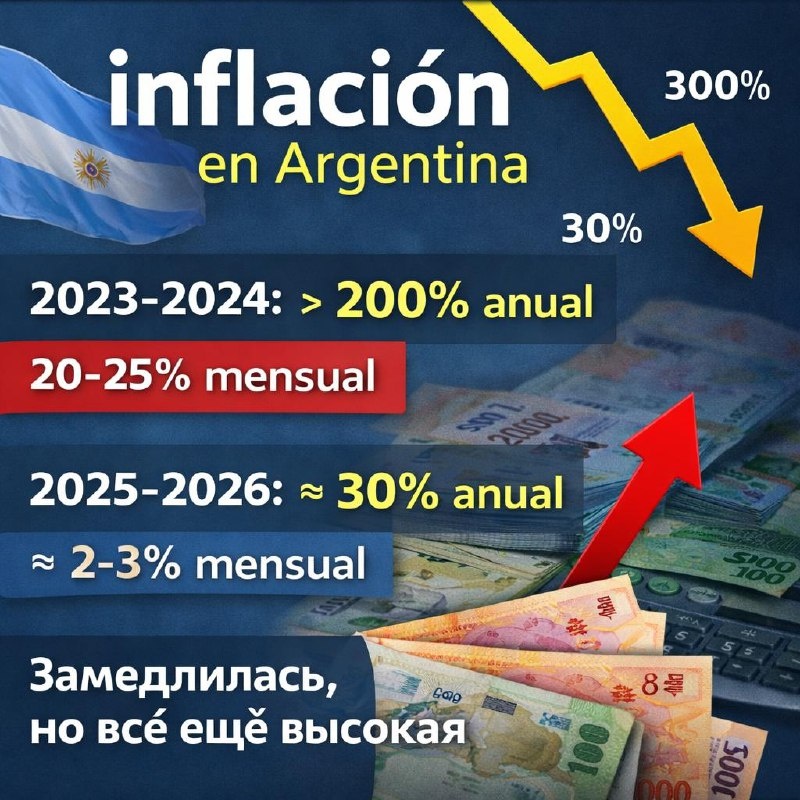 По итогам февраля 2026 года инфляция составила 2,8 % за месяц. Это выше ожиданий и продолжает держаться в диапазоне 2–3 % ежемесячно. В годовом выражении показатель сейчас находится на уровне около 30–32 %. Для понимания масштаба: ещё в 2023–начале 2024 года Аргентина переживала период гиперинфляционного разгона: — отдельные месяцы показывали 20–25 % за месяц — годовая инфляция превышала 200 % — в пиковые периоды цены удваивались меньше чем за год На этом фоне нынешние 2–3 % в месяц выглядят как серьёзное замедление. Но если пересчитать, то 2,8 % ежемесячно — это всё равно более 35 % в годовом выражении, если темп сохранится. Динамика последних полутора лет выглядит так: — 2024 год — резкий скачок цен и шоковая перестройка экономики — середина 2025 года — замедление до ~1,5 % в месяц — конец 2025 – начало 2026 — стабилизация на уровне 2–3 % Что это означает для нас всех? — продукты и услуги продолжают дорожать — бизнес закладывает инфляцию в цены — семейные бюджеты всё ещё под