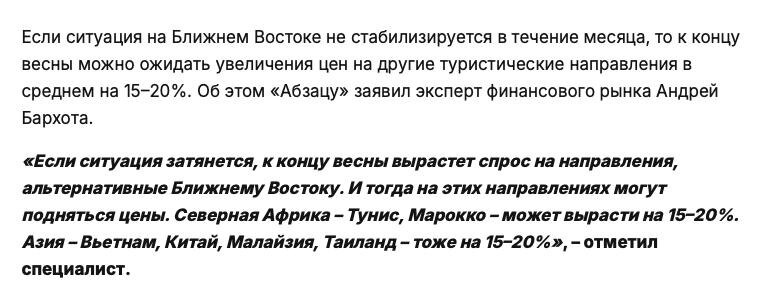). Если вы консультировались и еще думаете, напишите нам, потому что по многим отелям цены уже подросли и сейчас необходимо пересчитать заново. Если напряжённость на Ближнем Востоке затянется, то альтернативные направления могут еще подорожать в среднем на 15–20% к текущей цене (Тунис, Марокко, Китай, Таиланд, Вьетнам). Планируете летний отпуск в этом году - лучше зафиксировать условия сейчас (и спокойно доплатить позже). Перенос/отмена тура возможна за 30-60 дней до поездки. Кто ещё не бронировал отпуск на 2026, сейчас самое время. Пишите, что рассматриваете (страна, даты, состав) - быстро обновим расчёт и дадим 3–5 вариантов альтернатив. 👉 Написать #Раннеебронирвоание
