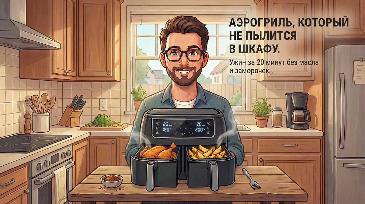 Знаете эти ящики на кухне, куда отправляется техника “на потом”? У меня там целое кладбище: йогуртница, вафельница, и — да — мой первый аэрогриль. Обидно, потому что я реально хотел его полюбить. Картошка фри без масла? Курица с корочкой за 20 минут? Звучало идеально. А потом началась реальная жизнь. Всё просто: я хотел готовить ужин, а не отдельные ингредиенты. Представьте: хочу курицу и картошку. Курица — 25 минут при 180 градусах. Картошка — 20 минут при 200. А чаша одна. Температура одна. И начинается цирк: Вариант 1: Готовлю по очереди. Сначала курица, потом картошка. Итого 45 минут, и курица уже остыла. Вариант 2: Запихиваю всё вместе, выбираю “средние” настройки. Картошка сырая, курица сухая. Или наоборот. Через месяц таких танцев аэрогриль переехал в тот самый ящик. Я вернулся к сковородке. Сидим на обеде, он говорит: “Я теперь ужин за 20 минут делаю”. Я думаю — ну, доставка, все так говорят. Он: “Нет, сам готовлю. В аэрогриле. У меня две чаши”. Я завис. Две чаши? Это как? Ока