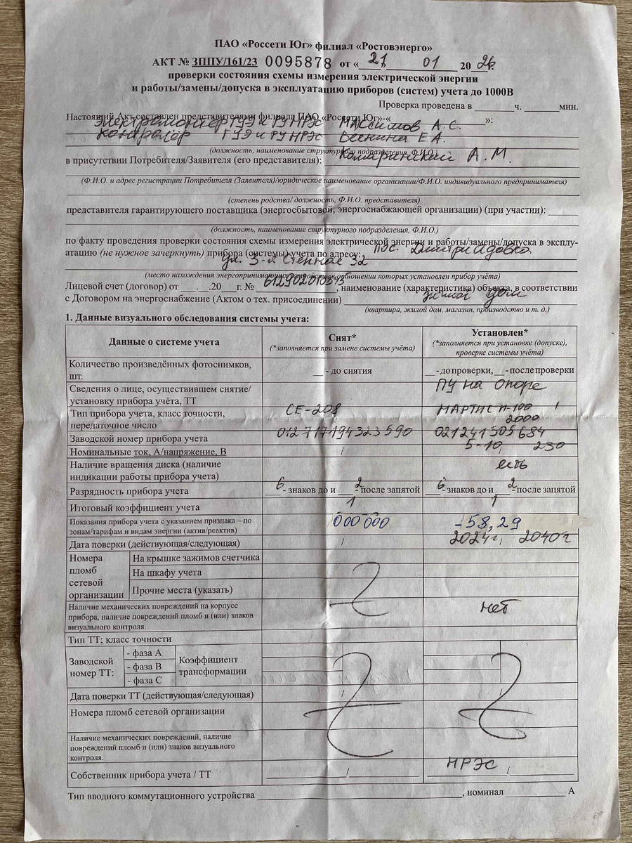 ПАО «Россети Юг» филиал «Ростовэнерго» в лице электромонтера и контролера был составлен и выдан АКТ № 3ППУ/161/230095878 от «21»01.2026 г. проверки состояния схемы измерения электрической энергии и работы/замены/допуска в эксплуатацию приборов (систем) учета до 1000В. Фотографию настоящего акта от «21»01.2026 г. (2 файла) прилагаю следующие. Акт был составлен с нарушением срока, который описал снятие старого счетчика, и установления нового прибора учета тип НАРТИС И-100 заводской номер 021241505684 на железобетонную опору (столб), по лицевому счету 612902010345. Также был выдан Выносной цифровой дисплей НАРТИС Д-101-2 на батарейках. По теме: Фото акта допуска в эксплуатацию электросчетчика: https://dzen.ru/a/aWoQk-uZpzaQR80b Приложение: Мои записи: https://dzen.ru/a/aWztCMz1OHIA3x2d © 2 день месяца Марта 2026 г. Чел. Антон М.К.