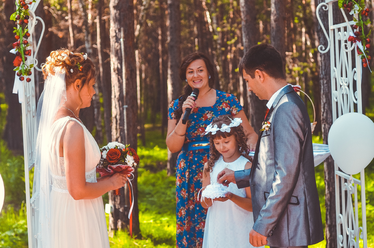Затем — выездная церемония. Мы организовали её в живописном месте за городом: на холме с видом на озеро, среди цветущих деревьев. Всё было продумано так, чтобы ничто не отвлекало от главного: