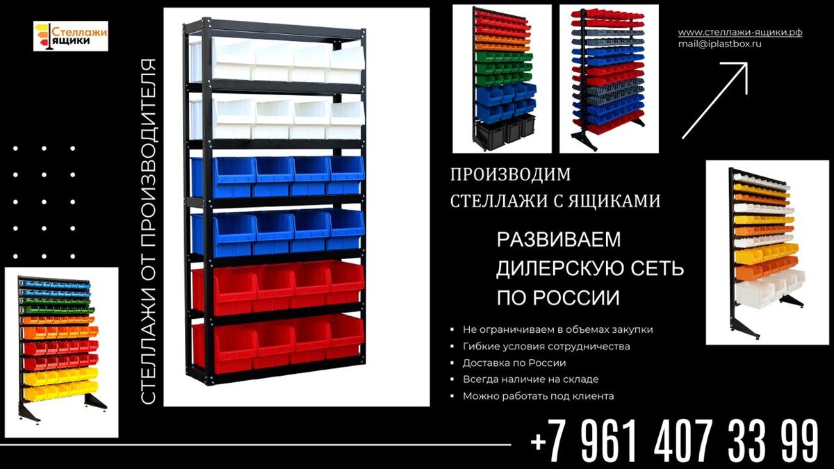 Мы — производители стеллажей с пластиковыми ящиками Это оборудование уже стало стандартом для: • магазинов крепежа, метизов, запчастей и автозапчастей • производственных цехов, заводов и сборочных участков • СТО, автосервисов, шиномонтажей • частных и профессиональных гаражей, мастерских Почему стеллажи с ящиками — must-have: → всё на виду, поиск за секунды → порядок вместо хаоса → меньше потерь и пересортицы → ускорение комплектации в 3–5 раз → окупаемость за 3–8 месяцев Мы ищем партнёров по всей России для расширения дилерской сети. Предлагаем: • выгодные дилерские цены • стабильные поставки со склада в наличии • маркетинговую поддержку (фото, видео, описания) • не ограничиваем в закупках, возможна отгрузка товара напрямую заказчику Вам не надо иметь собственный склад, мы все деаем за Вас. Вы только ПРОДАЕТЕ! наличие юридического лица (ИП или ООО) обязательно. Если вы занимаетесь продажей оборудования для складов, производства, автосервисов, инструмента или метизов — напишите нам