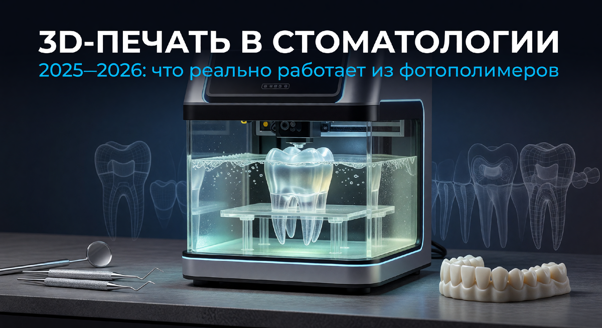 Привет! Это команда SmolArt. В 2025–2026 годах фотополимерная 3D-печать (SLA, DLP, mSLA) окончательно вошла в стоматологию. Коронки, мосты, элайнеры, хирургические шаблоны, временные протезы — всё это уже печатают в клиниках и лабораториях. Недавно вышел мощный обзор в журнале Polymers (Yüceer и др., 2025) — один из самых полных на сегодня по фотополимерам в стоматологии. Я переработал его под нас: без воды, с цифрами, примерами и тем, что реально важно для тех, кто печатает дома или думает о стоматологическом направлении. 1. Какие технологии сейчас лидируют 2. Какие смолы используют в стоматологии 3. Точность и усадка — что реально в 2026 4. Применение в реальной практике 5. Плюсы и минусы фотополимеров в стоматологии