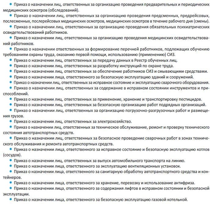 ? На практике часто распределяют обязанности по уровням управления (уровень работодателя в целом → уровень службы → уровень производственного участка → уровень бригады). Но есть и другой способ распределения ответственности — по направлениям работы. Как правило, это целая система приказов. Приводим примерный перечень таких приказов.