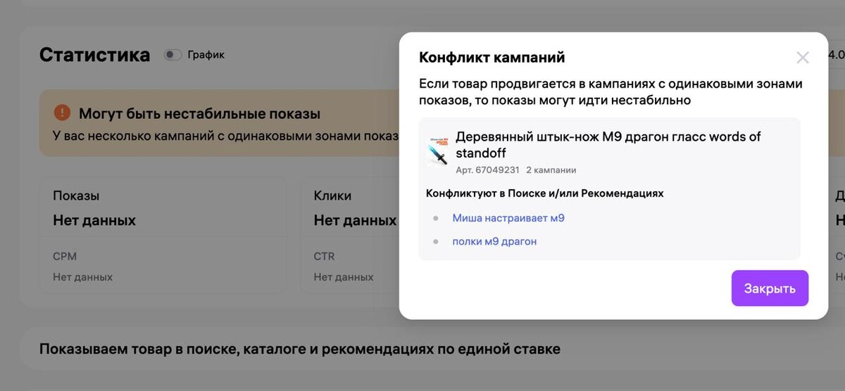 ВБ в рекламных кампаниях начал показывать сообщение о «конфликтах кампаний» ❗️Пугаться не стоит Официальная позиция вб по прежнему: «Если для одного товара запустить несколько кампаний, товар будет продвигаться в той, где сможет занять позицию выше. В этом случае показы могут быть нестабильными или их не будет совсем.» На практике все по прежнему: по каждой зоне/кластеру работает та кампания где ставка получается выше.