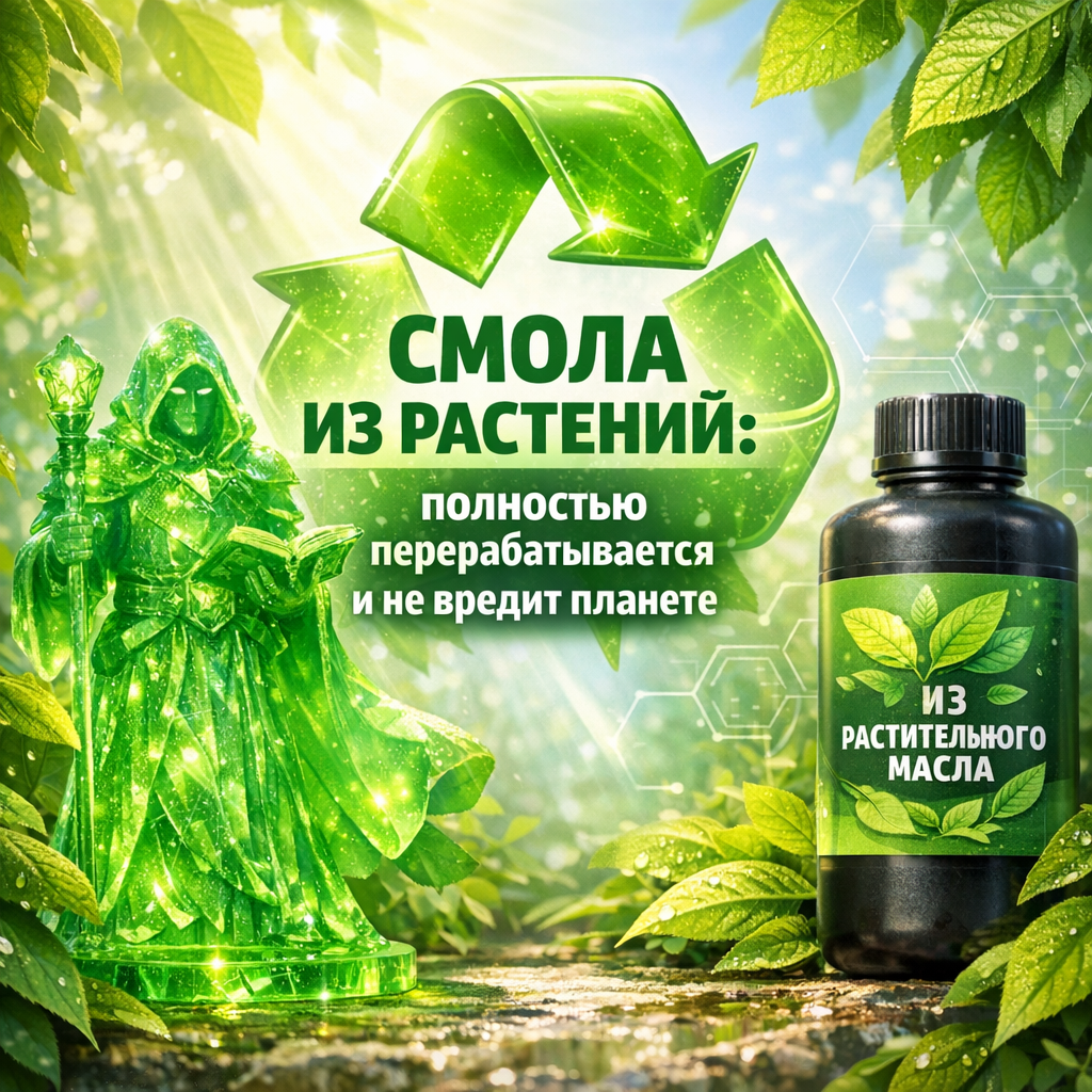 Привет! Это команда SmolArt. В 2024 году в журнале Nature вышла статья, которая до сих пор считается одним из самых важных прорывов в фотополимерной печати. Авторы (Machado et al.) создали первую полностью возобновляемую и 100 % перерабатываемую смолу для SLA/DLP/mSLA — и она не просто «экологичная на бумаге», а реально работает в принтерах и даёт отличные результаты. Почему это важно именно в 2026 году? Потому что сейчас, когда resin-печать стала массовой (миллионы принтеров по домам), отходы смолы — это уже огромная проблема. Каждый литр обычной смолы = ~0.8–1 кг пластикового мусора, который почти невозможно переработать. А эта смола — из растительного масла — перерабатывается бесконечно без потери свойств. Что сделали авторы Ключевые характеристики смолы (реальные цифры из статьи) Как это работает на практике