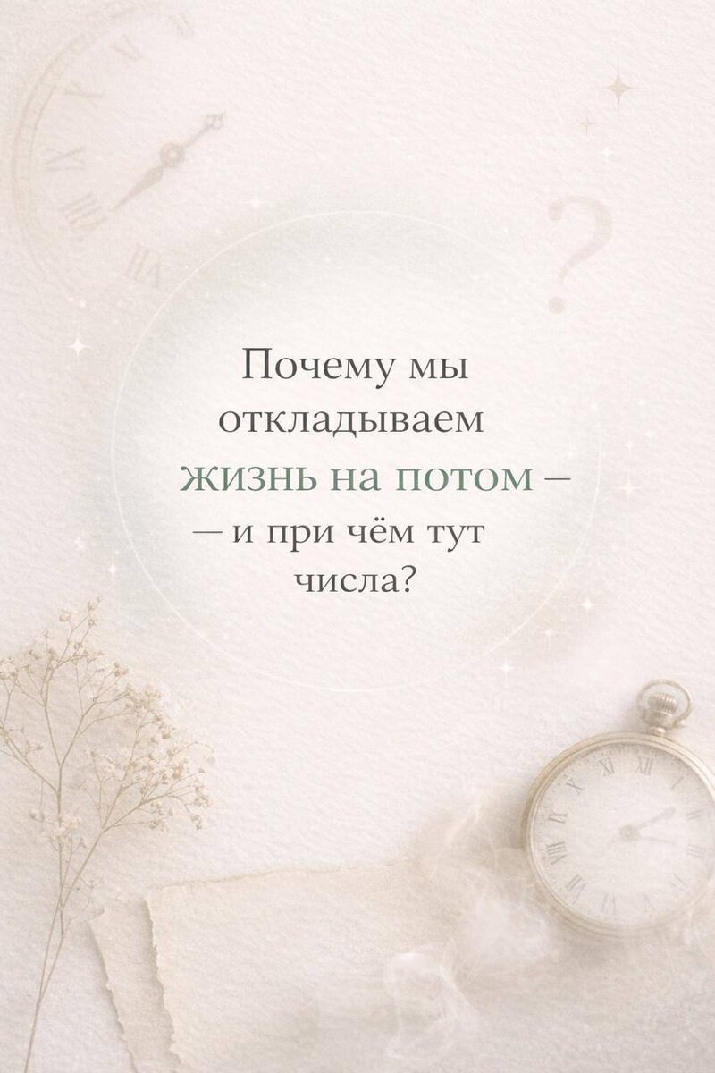? Вы замечали, как это происходит? 👉 начать новую жизнь — с понедельника 👉 заняться собой — когда появится время 👉 сменить работу — «вот ещё чуть-чуть потерплю» 👉 жить для себя — когда дети вырастут / кредиты закроются / звёзды сойдутся И так проходит… не неделя. Иногда — годы. Мы думаем, что дело в лени. В нехватке времени. В обстоятельствах. Но чаще всего причина — в нашей внутренней программе. И её прекрасно видно в числах. 🔢 Кто откладывает чаще всего? рожденные 2, 6, 11, 15, 20, 24, 29 ждут удобного момента и одобрения (идеального момента не существует) рожденные 4, 13, 22 готовится так долго, что жизнь меняется быстрее, чем планы рожденные 7, 16, 25 уходит в размышления и пропускает время действия рожденные 9, 18, 27 хочет идеального результата и поэтому не начинает 🔥 А кто начинает сразу? 1 (рожденные 1, 10, 19, 28) — пока остальные думают 5 (рожденные 5, 14, 23) — пока остальные боятся 8 (рожденные 8, 17, 26) — пока остальные сомневаются Но даже они иногда