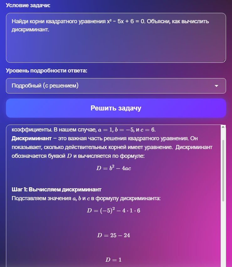 Математика, алгебра, физика, химия и многое другое. Бесплатно и с подробным объяснением. Перейдите на страницу сайта: «Твой помощник» Скопируйте текст из учебника или напишите своими словами. Пример: «Найди корни квадратного уравнения x² - 5x + 6 = 0. Объясни, как вычислить дискриминант.» Через 30–60 секунд вы увидите готовое решение — с формулами и пояснениями. 🔥 ЕСТЬ КРУТАЯ ВОЗМОЖНОСТЬ Не писать руками и даже не копировать текст,