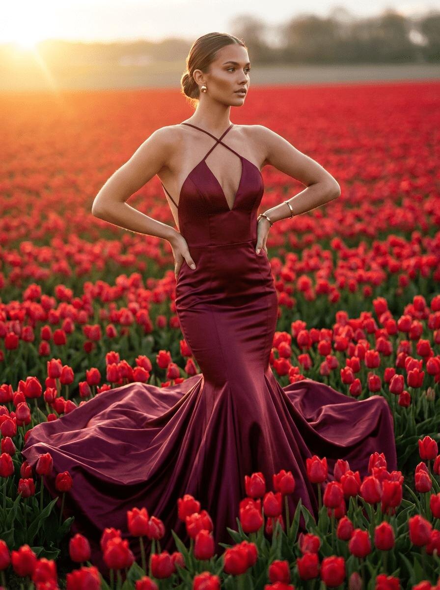 Модель: Nano Banana Сгенерировать🪄 Используй лицо девушки с загруженного фото. Редакционная фэшн-фотография, ультрадетализированное 8K, вертикальный формат 2:3. Молодая женщина со слегка загорелой кожей стоит в густом поле цветущих красных тюльпанов, лепестки на уровне пояса. Лицом к камере, руки на бёдрах — уверенная поза. Волосы убраны в гладкий низкий пучок. На ней драматичный вечерний бордовый атласный силуэт «русалка»: облегающий бёдра и расклешённый к низу. Глубокий вырез горловины с перекрещивающимися бретелями, открыты плечи и спина. Платье струится роскошными складками, мерцая в золотом свете. Золотые серьги-гвоздики и тонкий браслет на правом запястье. Освещение: естественный стилизованный свет заката — золотое солнце низко слева, драматично подсвечивает силуэт. Фон с цветами слегка размыт. Ракурс слегка сверху, средний план. Романтичная, роскошная, редакционная атмосфера. Естественная кожа без пластика.