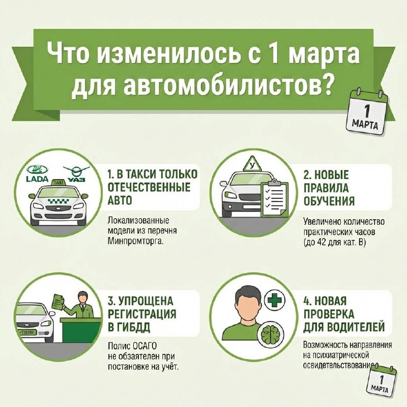 ? ⏩В такси теперь смогут работать только отечественные авто Теперь в региональные реестры такси включают только локализованные в России модели из перечня Минпромторга. В него входят автомобили брендов Lada (Granta, Vesta, Largus и др.), УАЗ («Патриот», «Хантер»), Sollers (SP7), Evolute, Voyah и Москвич. Минпромторг пообещал расширить список, но обновлённый перечень пока не опубликован. По неофициальным данным, в него могут войти модели Haval, Solaris, Tenet и автомобили калининградского «Автотора». О готовности работать в такси также заявила Волга. ⏩В силу вступили новые правила обучения в автошколах Для категории «B» увеличено количество практических часов — с 38 до 42. Желающие получить права категорий C и D, а также водители такси (категория B) теперь могут проходить обучение не только в автошколах, но и в профильных организациях — на базе автопарков и таксопарков. Теоретическую часть разрешено изучать дистанционно при обязательном контроле посещаемости и успеваемости. Обновле