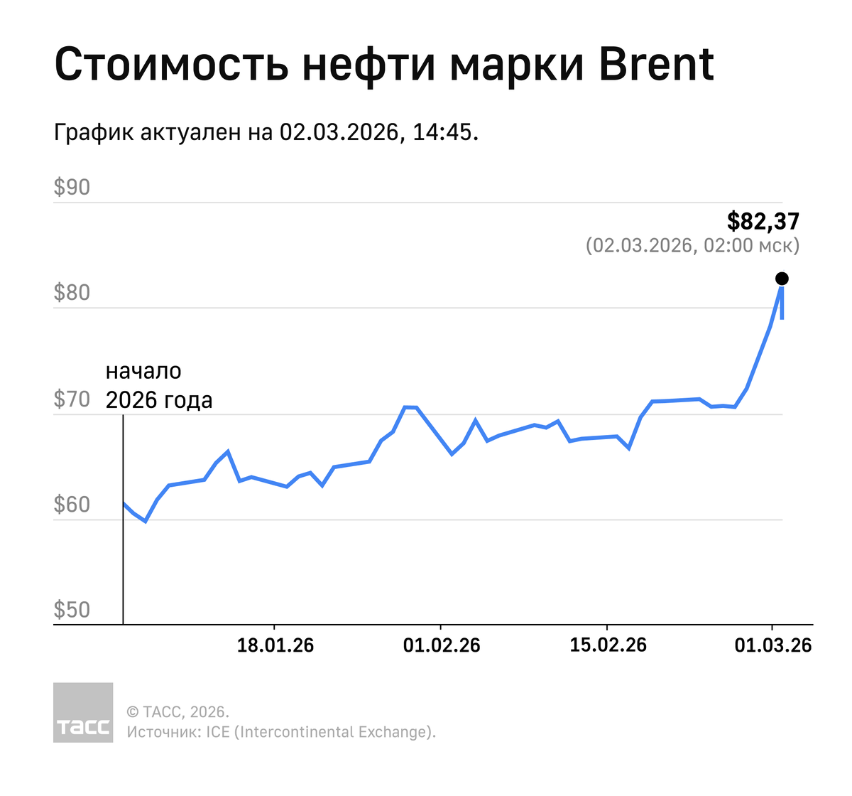 Фьючерс на нефть марки Brent рос до $82,37 за баррель (по данным на 2 марта 02:00 мск) на лондонской бирже ICE: рынок отреагировал на военную операцию США и Израиля против Ирана. Цена превысила отметку $82 впервые с 16 января 2025 года. Позднее рост замедлился, цена опустилась до $77,7 за баррель (по данным на 14:45 мск). Подробнее о динамике цен на Brent с начала 2026 года — в инфографике ТАСС.