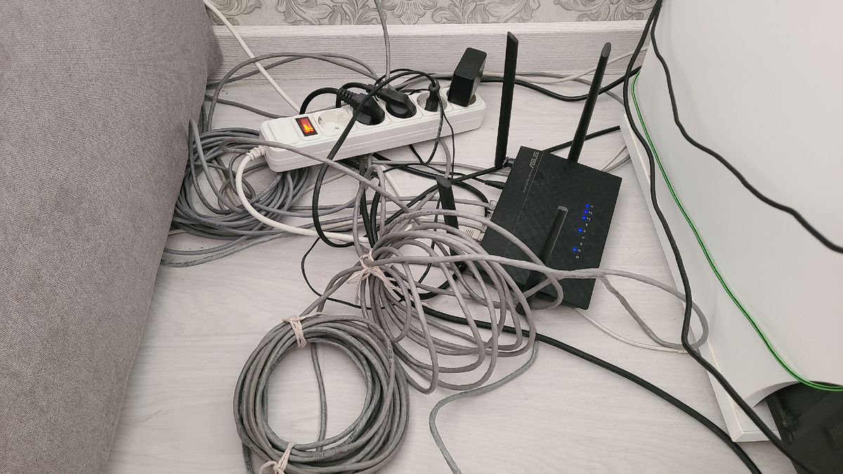 У нас была такая путаница с проводами: некрасиво, неудобно, даже пол нормально протереть сложно. Всё выглядело прямо как в тех видео про азиатские страны, где на улицах висят огромные пучки проводов😃.