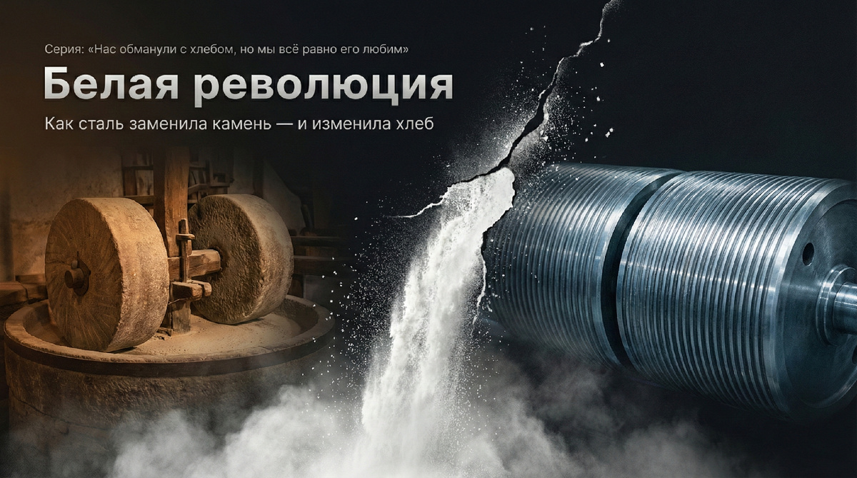 Как стальные цилиндры заменили каменные жернова. Как из зерна вырвали душу — и получили продукт, который не гниёт, не пахнет и не кормит. Как белая мука пересекла океан, убила четверть миллиона человек — и как государства были вынуждены законодательно возвращать в хлеб то, что из него забрали. Это не просто технологическая история. Это история о том, как удобство победило питание. И почему мы до сих пор расхлёбываем последствия.