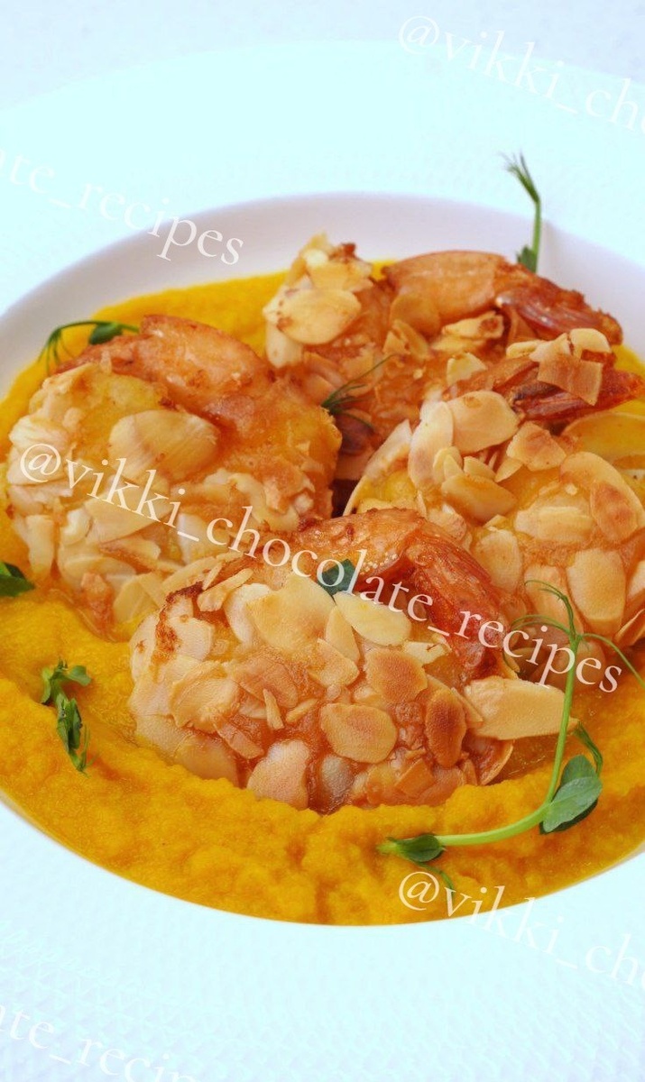 на 4 порции* основа: 🍤креветки сырые 500 🥣кляр 300 (100 отложить) 🧊ледяная вода 200 🥜миндальные лепестки 140 🫗растительное масло пюре: 🥕морковь 200 🧅лук 100 🍏яблоко 100 🧄чеснок 1з 🍊сок апельсина 50 🫗вода 400 🫚имбирь сух 1чл 🥄карри 1сл 🧂соль лук мелко нарезаем, морковь натираем и обжариваем до золотистости, добавляем специи, кубики яблока и заливаем соком и водой, тушим около 20 мин чтобы жидкость испарилась на 2/3 и пробиваем блендером до пюре кляр замешиваем 1к1 с ледяной водой (это важный момент, так корочка будет хрустящей), креветки солим, обваливаем в сухом отложенном кляре, затем в жидкий кляр и в миндальные лепестки обжариваем сразу же по 2-3 мин на раскаленном масле, креветки должны иметь возможность немножко плавать в нем перекладываем на бумажное полотенце, чтобы впиталось лишнее масло выкладываем креветки на пюре и поедаем сразу же✨ ❗️а если вы любите вкусно кушац, но не любите придумывать меню и считать ккал, то в моём tg-канале https://t.me/vikkichocolate/13