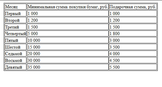 За открытие нового брокерского счета и его регулярное пополнение Совкомбанк Инвестиции обещает давать хороший бонус. В табличке ниже можно посмотреть на какую сумму надо покупать активы каждый месяц и какую сумму за это начислит брокер.