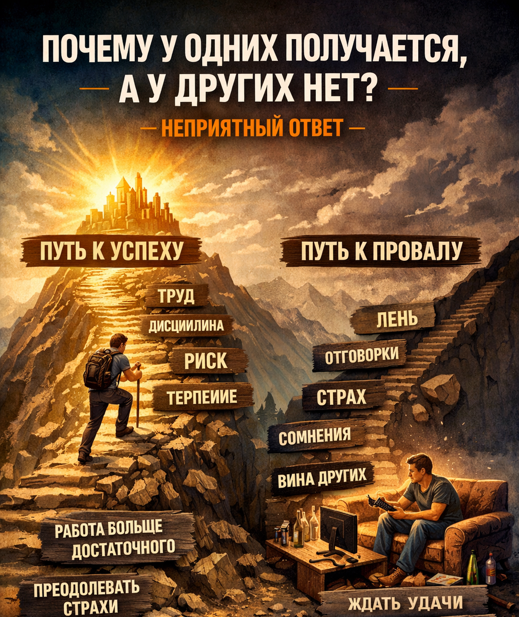 Есть темы, о которых принято говорить мягко, красиво и дипломатично. Эта - не из них. Почему у одних людей получается добиться цели, вырасти, изменить жизнь, а у других - нет? Почему двое стартуют с одинаковых условий, одинаковым возрастом, даже одинаковыми возможностями - но приходят в разные точки? Ответ неприятный. Но честный. Большинство людей говорят о желании, но не подтверждают это действием. «Хочу изменить жизнь», «хочу похудеть», «хочу зарабатывать больше», но реального движения нет. Настоящее желание всегда подтверждается конкретным шагом, даже маленьким. Ложное - остаётся в виде разговора и внутреннего кинофильма. Если человек не делает - значит, не хочет. Иногда - даже если он сам в это верит. Все заряжены в начале. Никто не заряжен на 103-й день, когда результат все ещё не виден. Выигрывает не самый умный, не самый талантливый и даже не тот, кто работает больше всех в единицу времени. Выигрывает тот, кто не сливается через месяц. Парадокс? Большинство не проигрывают - они