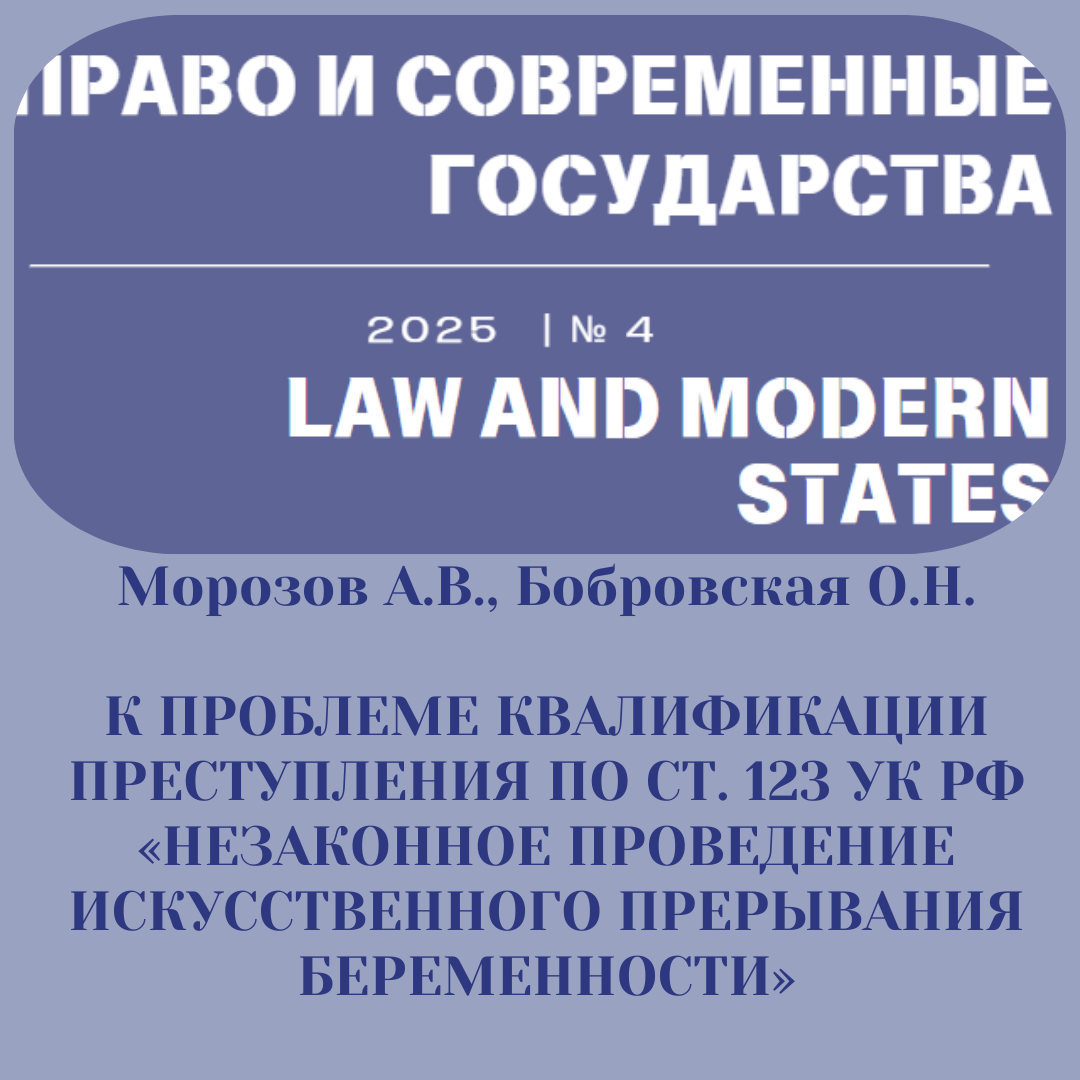 Представляем публикации 4 номера 2025 года Журнала «Право и современные государства» К ПРОБЛЕМЕ КВАЛИФИКАЦИИ ПРЕСТУПЛЕНИЯ ПО СТ. 123 УК РФ «НЕЗАКОННОЕ ПРОВЕДЕНИЕ ИСКУССТВЕННОГО ПРЕРЫВАНИЯ БЕРЕМЕННОСТИ» Морозов Александр Владимирович – доктор педагогических наук, профессор, главный научный сотрудник НИИ ФСИН России, e-mail: doc_morozov@mail.ru. Бобровская Ольга Николаевна – кандидат юридических наук, доцент кафедры медицинского права, Первый Московский государственный медицинский университет имени И.М. Сеченова, e-mail: bobrovskaya_o_n@staff.sechenov.ru. УДК343.6 ННС5.1.4 Аннотация: в статье рассмотрена проблема квалификации составов преступления, обусловленного незаконным прерыванием беременности, выявляется необходимость их преобразования, с более тщательной детализацией конструкции объективной стороны, дополненной факультативными признаками, выводящими восприятие данного преступления, как представляющего общественную опасность и нуждающегося в адекватных мерах уголовно-правового реаг