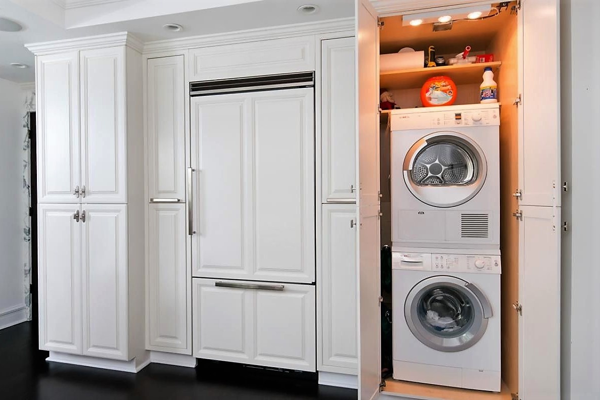 - Сушка: Идеальное решение — колонна из стиральной и сушильной машин. Это особенно актуально, если вы объединили лоджию с квартирой и не хотите загромождать пространство раскладными сушилками.