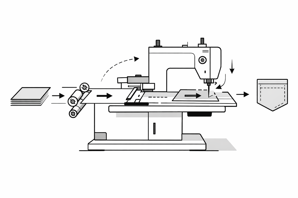 Карман кажется простой деталью, но на практике его обработка требует точности и аккуратности. Неровная строчка, перекос рамки или разная ширина отступов сразу бросаются в глаза и портят внешний вид изделия. Поэтому на современных швейных производствах все чаще используют машины для автоматического изготовления карманов. Автомат для изготовления карманов – это программируемая швейная машина, которая выполняет полный цикл обработки по заданному алгоритму. Оператор размещает детали в рабочей зоне и запускает программу, а оборудование самостоятельно формирует карман и выполняет строчки с одинаковой геометрией на каждом изделии. Такие машины относятся к шаблонным автоматам. Они работают по установленной траектории и каждый раз повторяют операцию с высокой точностью. За счет этого удается обеспечить одинаковый результат в серии, независимо от объема партии. При ручной обработке кармана швее приходится последовательно выполнять несколько операций. Нужно заутюжить припуски, совместить детали,
