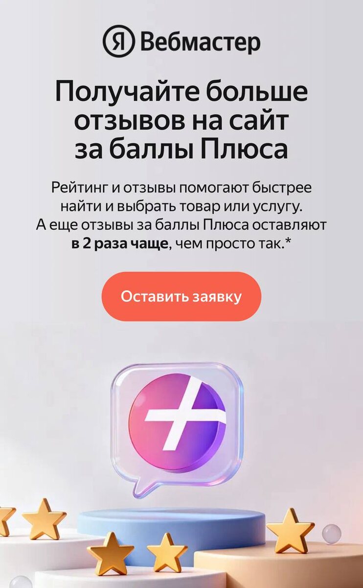 Рейтинг и отзывы помогают клиентам быстрее выбрать вас. А если мотивировать баллами Плюса — отзывы оставляют в 2 раза чаще*. По данным внутренних исследований. Вы подключаете услугу и вносите бюджет. Яндекс определяет ваших реальных клиентов и просит их оставить отзыв — через пуш‑уведомления и другие каналы. Клиент пишет отзыв и получает 10–200 баллов — в зависимости от полноты отзыва и наличия фото или видео. Вы получаете свежие отзывы, которые без напоминания не появились бы. ✅ Отзывы собираются на ваш сайт, а не в карточку организации на Картах.