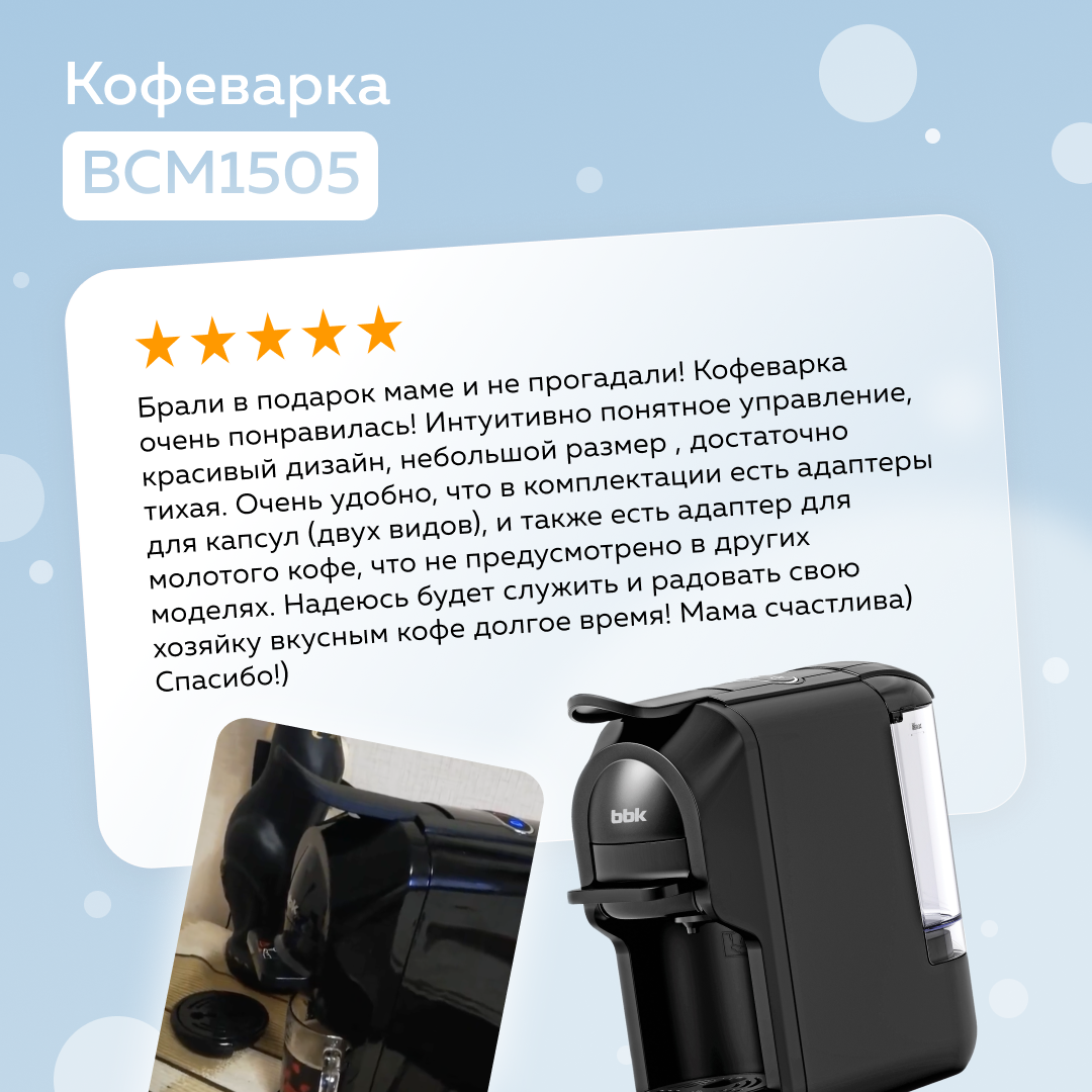 Мария — наш покупатель! Она выбрала капсульную кофеварку BBK BCM1505. Отличное решение для тех, кто ценит вкуснейший аромат и яркий вкус любимого напитка.