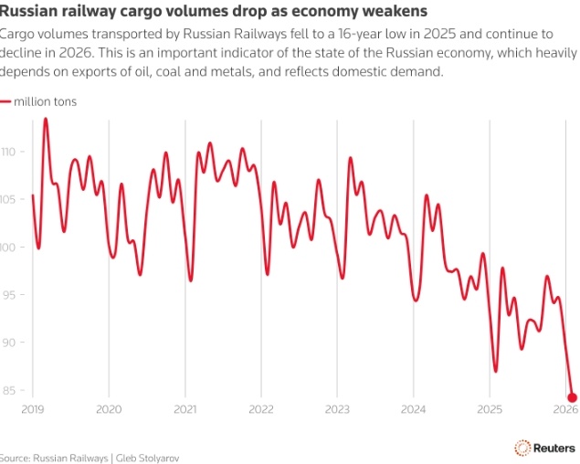 В феврале в России продолжилось снижение объемов железнодорожных грузоперевозок из-за замедления экономики, что усугубило положение и без того обремененной долгами государственной железнодорожной монополии. Кризис в железнодорожной отрасли России, вызванный замедлением экономической активности, санкциями и давлением мирового рынка, в феврале обострился, ухудшив положение государственной железнодорожной монополии, уже обремененной долгами. В России, где значительная часть промышленных товаров перевозится по железной дороге, объемы грузоперевозок служат важным индикатором состояния экономики. В понедельник Российские железные дороги сообщили, что в феврале объем грузоперевозок сократился на 3,2%, достигнув 84,2 миллиона метрических тонн. С октября 2023 года, за исключением кратковременной стабилизации в октябре прошлого года, объемы грузовых перевозок снижаются ежегодно. В более широком контексте отмечается замедление экономического роста: российская экономика выросла лишь на 1% в 2025 г