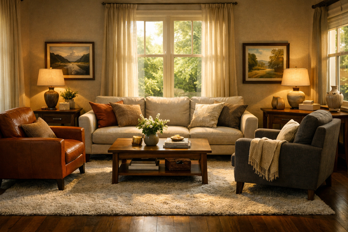 Классика жанра: диван плюс два кресла напротив, под углом друг к другу. Почему это работает? Потому что такая схема создаёт пространство для разговора, не превращая комнату в зал ожидания с рядами стульев вдоль стен. Люди сидят лицом друг к другу, угол обзора комфортный, никто не тянет шею.