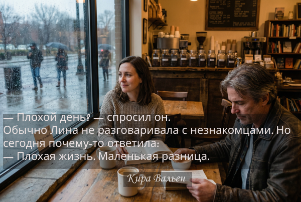 В кофейне на окраине города пахло корицей и тишиной. Не той тишиной, от которой хочется бежать, а той, в которой можно спрятаться. За окном моросил февраль, редкие прохожие торопились по своим делам, а Лина сидела за столиком у окна и в сотый раз прокручивала в голове утренний разговор с начальником. «Мы вынуждены сократить ставку. Вы понимаете, кризис». Она понимала. В свои тридцать восемь она понимала слишком многое: что ипотеку платить ещё двенадцать лет, что дочке нужны новые ботинки, что бывший муж исправно переводит алименты, но их хватает только на коммуналку. И что она устала. Так устала, что даже кофе заказала просто так — сидеть и не идти домой, где пусто и холодно. — У вас молоко убежало. Она подняла голову. За соседним столиком сидел мужчина с книгой. Он кивнул на её чашку — пенка действительно медленно ползла через край. — Чёрт. Лина промокнула лужицу салфеткой и только тут заметила, что пальцы дрожат. Она сжала их в кулак, спрятала под стол. — Плохой день? — спросил он. О