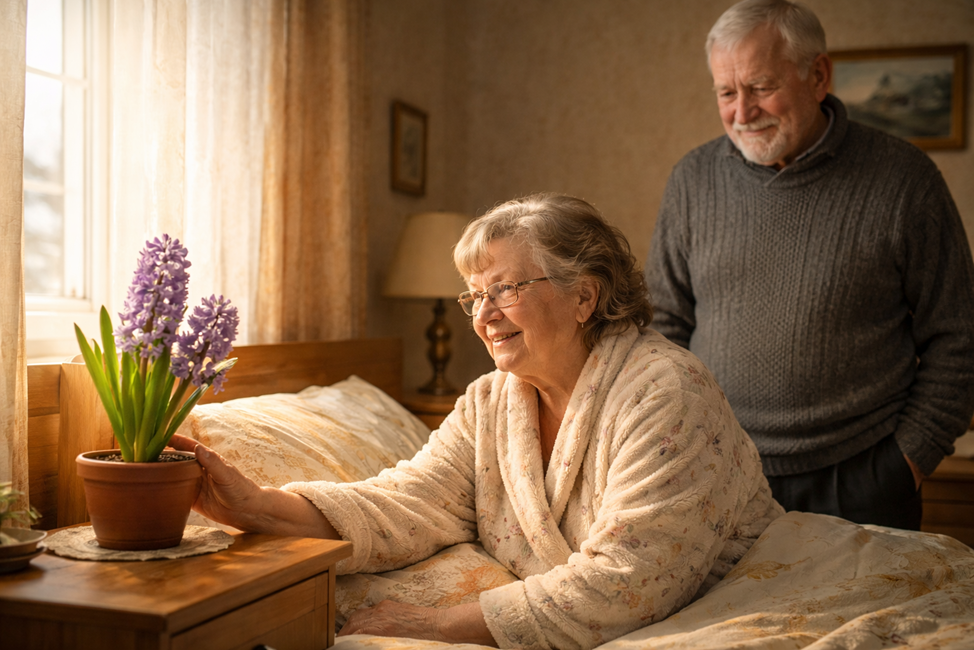 Зинаида Максимовна сидела в большой комнате, принимала поздравления, смеялась, рассматривала подарки. На тумбочке в спальне стоял гиацинт - она специально не убирала, пусть цветет там.