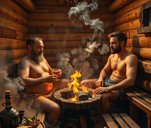 Иван, плотный мужчина с красным от жара лицом и короткой стрижкой, отхлебнул из кружки травяного чая и вытер пот со лба махровым полотенцем. Руслан, худощавый и жилистый, с восточными чертами лица, подкинул еще пару поленьев в печь, отчего в бане стало еще жарче. Третий, молчаливый и задумчивый, по имени Марат, сидел, опустив голову, словно погруженный в глубокие размышления.