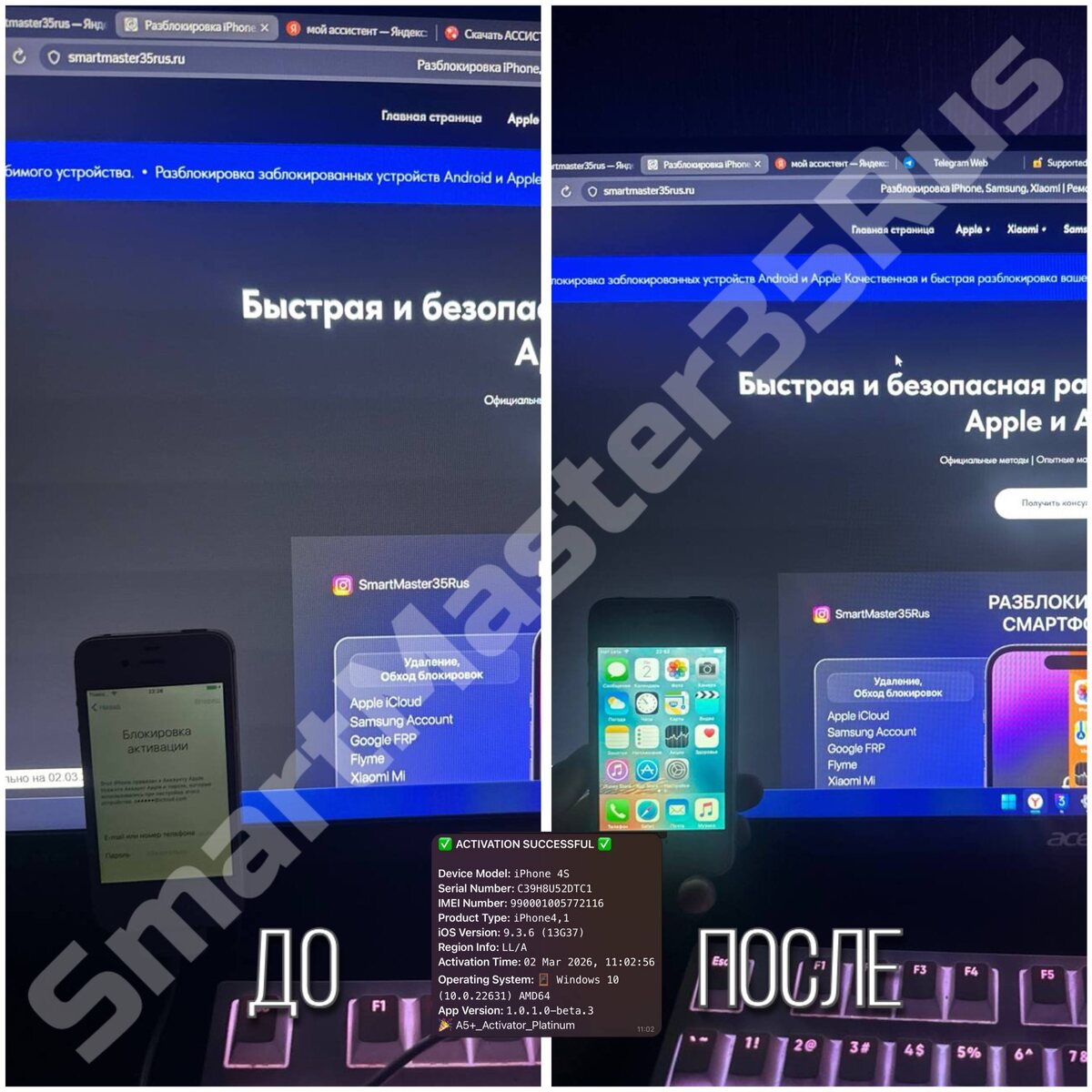 Разблокировка Обход iCloud блокировки (hello screen) без Sim выполнен ✅ - Untethered Activation. - Все iService работают (iMessage/FaceTime/AppStore/iCloud) - Добавлены функции блокировки обновлений + фейк сброс. - без PwnDFU, без jailbreake ❤️🔥 - Дистанционно 👨💻 - Свой А5 Activator Platinum🔥