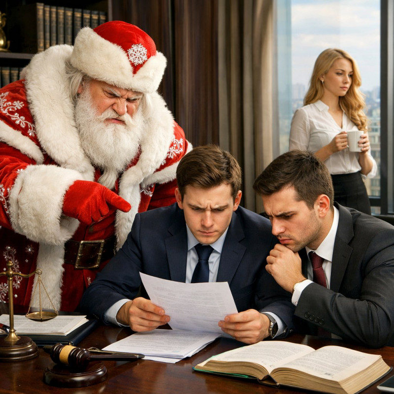 Тридцать первого декабря офис юридической фирмы «Юстас» вяло коротал последний рабочий день года. Юрист Антон, широко зевая, включал компьютер, стажер Маша пила свой кофе и смотрела на снегопад, постукивая ноготками по чашке. Бухгалтер Маргарита Петровна, глядя в зеркальце, медленно вела по нижней губе красной помадой. Водитель шефа Лёха вышел в магазин за любимым пирожным картошка.