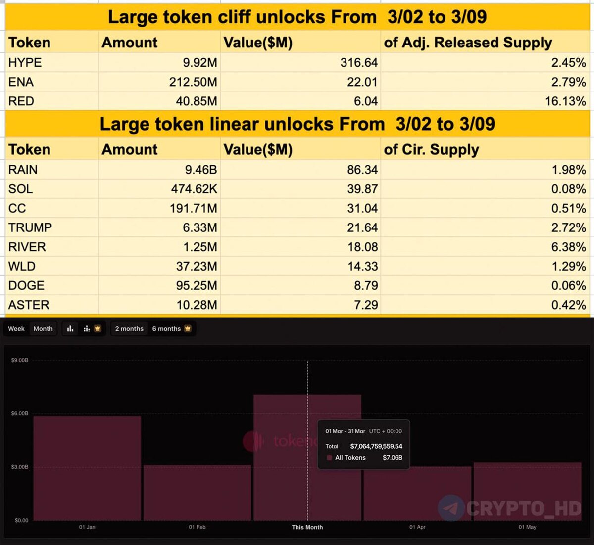 🔒 В этом месяце разблокируют альткоины на $7,060,000,000 – Tokenomist ТОП разблокировок токенов со 2 марта по 9 марта: Cliff Unlocks: ▫️#HYPE - $316,64m ▫️#ENA - $22,01m ▫️#RED - $6,04m Linear Unlocks: ▫️#RAIN - $86,34m ▫️#SOL - $39,87m ▫️#CC - $31,04m ▫️#TRUMP - $21,64m ▫️#RIVER - $18,08m ▫️#WLD - $14,33m ▫️#DOGE - $8,79m ▫️#ASTER - $7,29m Crypto Headlines
