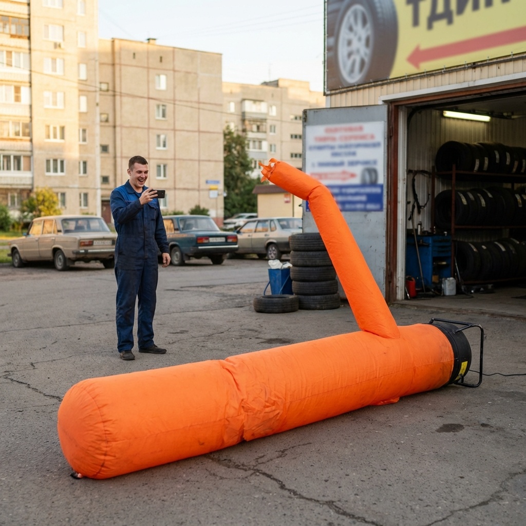Дмитрий из подмосковного Селятино не планировал становиться звездой интернета. Владелец обычного шиномонтажа в спальном районе использовал традиционные методы привлечения клиентов — надувной зазывала у дороги стал классическим решением для автосервиса.