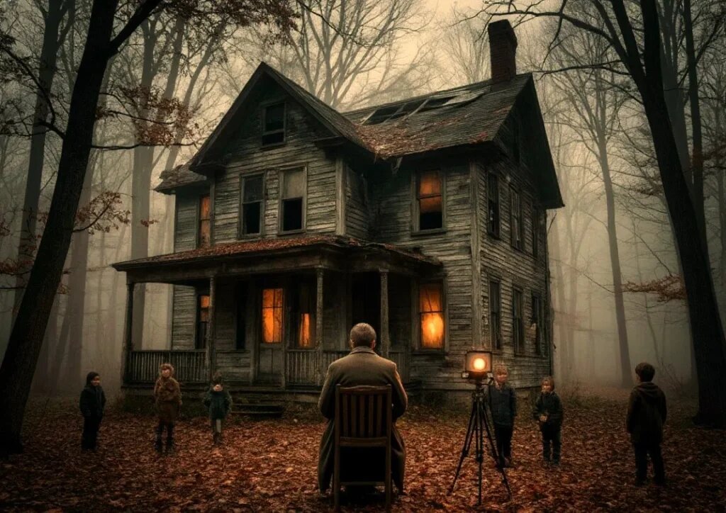 На поляне стоял старый дом — не заброшенный, а будто неправильный. Окна были слишком высокими, дверь — слишком узкой. Перед ним, на стуле, сидел человек в длинном пальто. В руках — старинный фотоаппарат на треноге.
